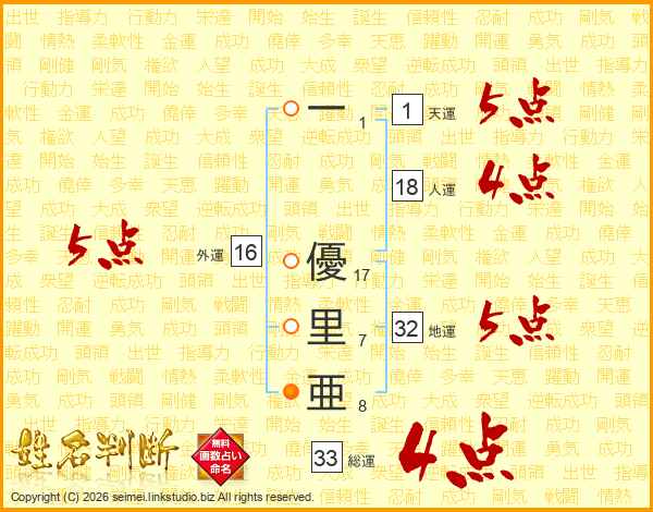 一(1画) 優(17画)里(7画)亜(8画)