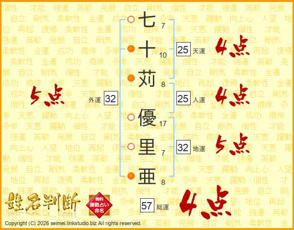 七十苅優里亜さんの総運は57画の4点!