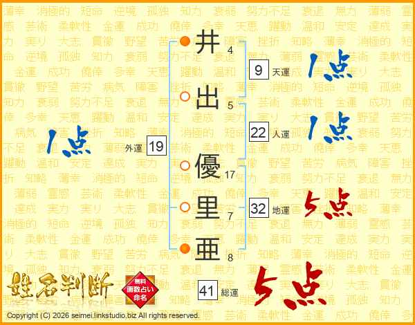 井(4画)出(5画) 優(17画)里(7画)亜(8画)