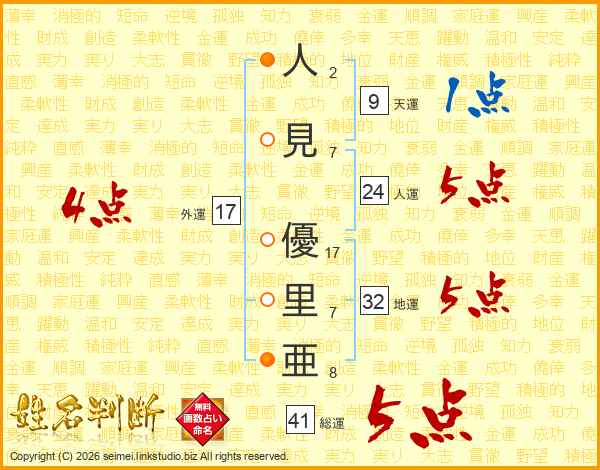人(2画)見(7画) 優(17画)里(7画)亜(8画)