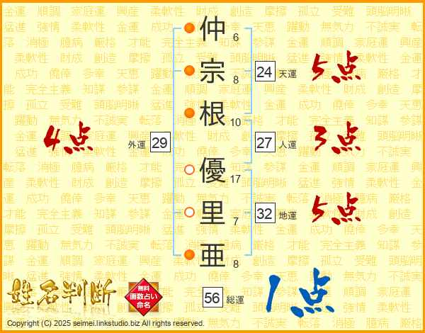 仲(6画)宗(8画)根(10画) 優(17画)里(7画)亜(8画)