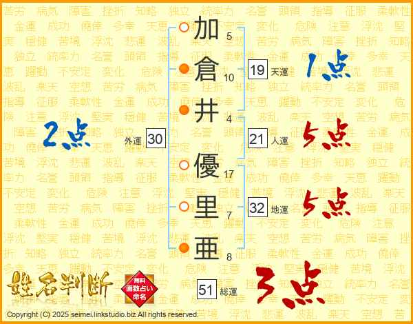 加(5画)倉(10画)井(4画) 優(17画)里(7画)亜(8画)