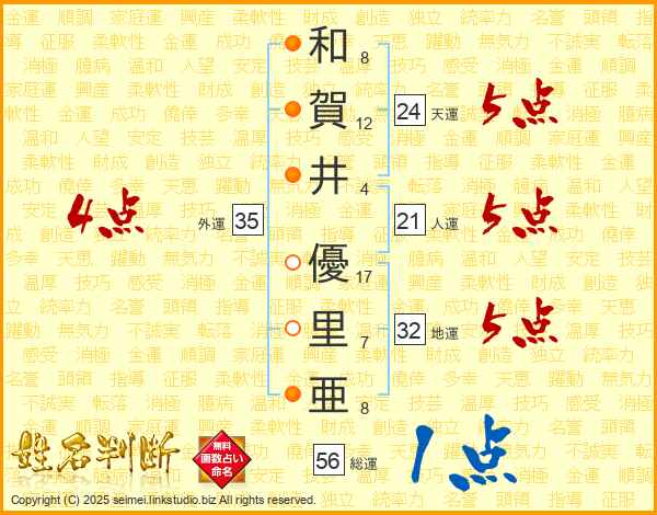 和(8画)賀(12画)井(4画) 優(17画)里(7画)亜(8画)