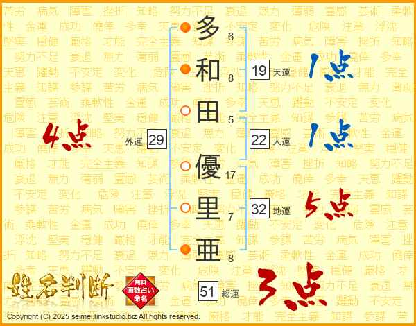 多(6画)和(8画)田(5画) 優(17画)里(7画)亜(8画)