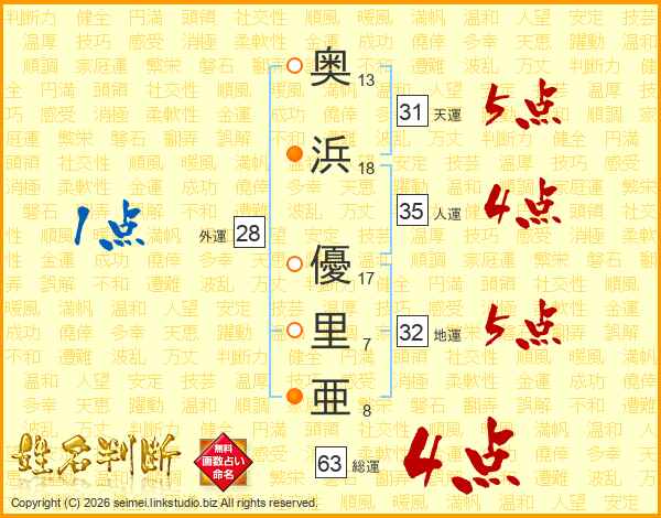 奥浜優里亜さんの総運は63画の4点!