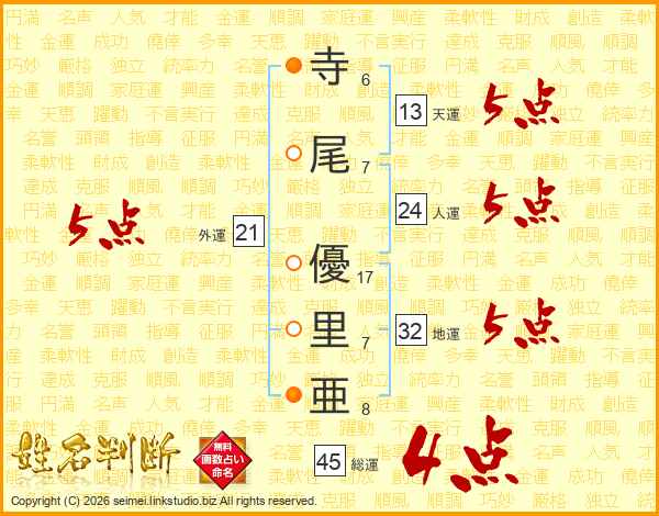 寺(6画)尾(7画) 優(17画)里(7画)亜(8画)