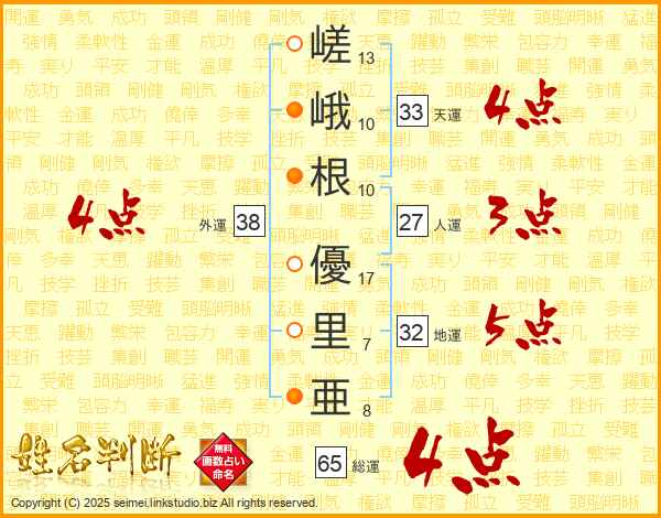 嵯峨根優里亜さんの総運は65画の4点!