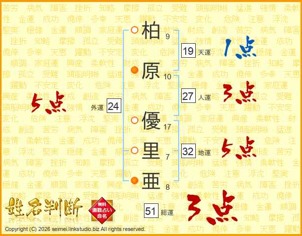 柏(9画)原(10画) 優(17画)里(7画)亜(8画)