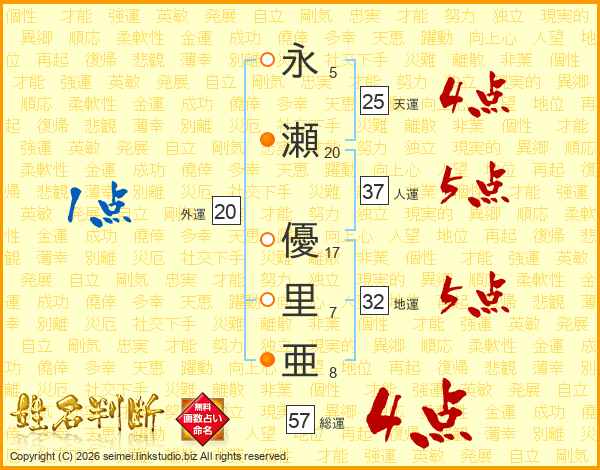 永瀬優里亜さんの総運は57画の4点!