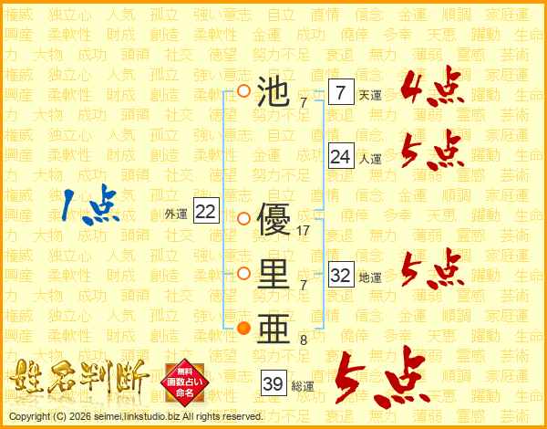 生活面を象徴する運勢です。外部から受ける影響力を表し、結婚運、家庭運や職場、環境への順応性を表します。総運から人運を引いた画数。姓や名が1文字の場合を除く。