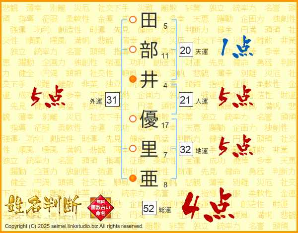 田(5画)部(11画)井(4画) 優(17画)里(7画)亜(8画)