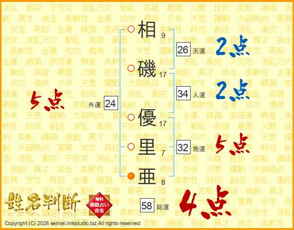 相磯優里亜さんの総運は58画の4点!