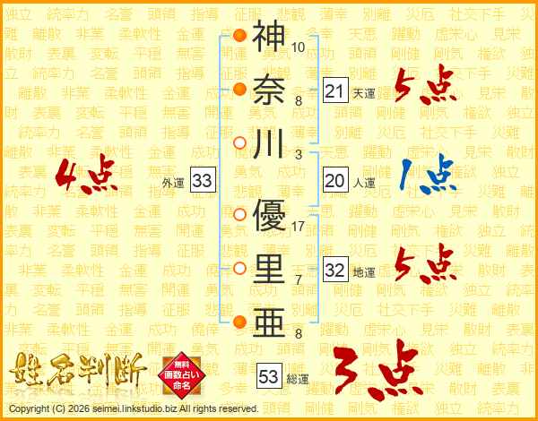 神奈川優里亜さんの外運は33画の4点!