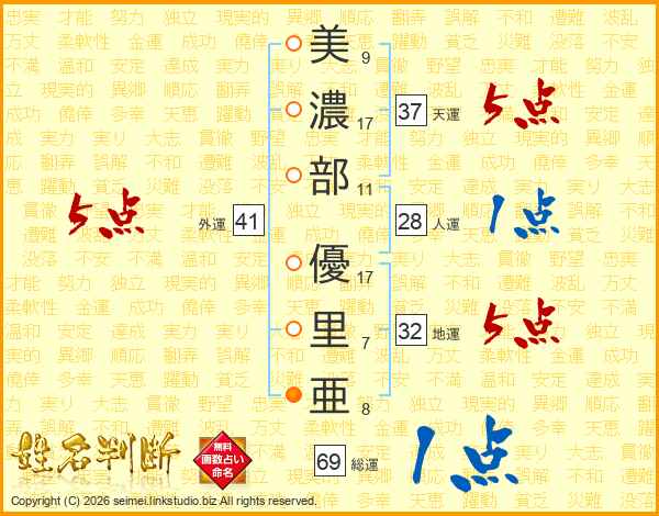 美(9画)濃(17画)部(11画) 優(17画)里(7画)亜(8画)