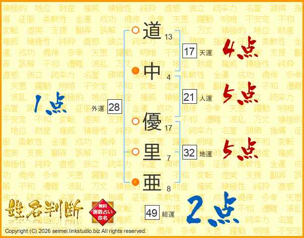 道(13画)中(4画) 優(17画)里(7画)亜(8画)