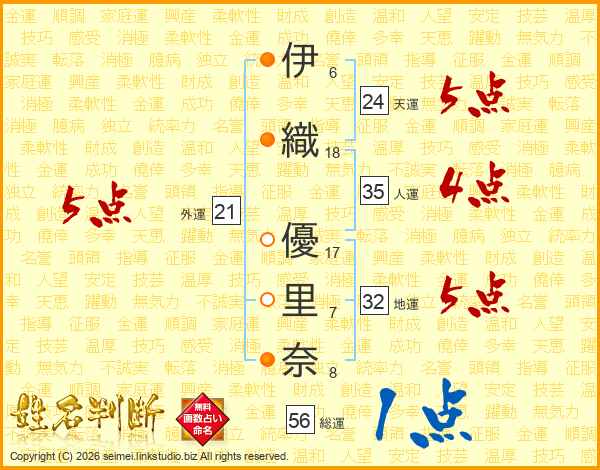 伊(6画)織(18画) 優(17画)里(7画)奈(8画)