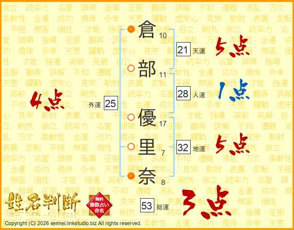 倉(10画)部(11画) 優(17画)里(7画)奈(8画)