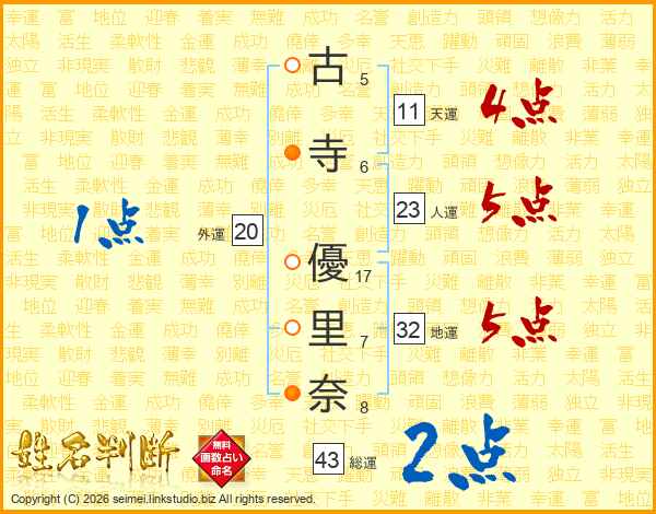 古(5画)寺(6画) 優(17画)里(7画)奈(8画)