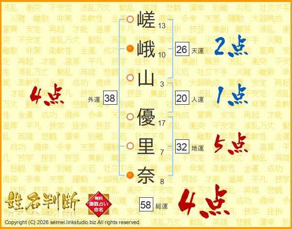 嵯峨山優里奈さんの総運は58画の4点!