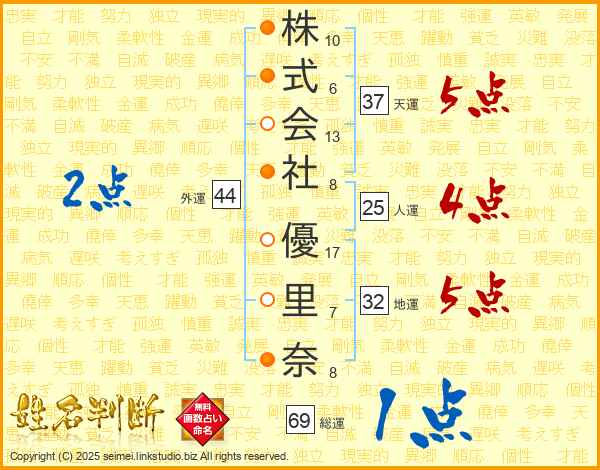 株式会社優里奈さんの人運は25画の4点!