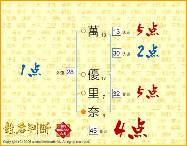 生活面を象徴する運勢です。外部から受ける影響力を表し、結婚運、家庭運や職場、環境への順応性を表します。総運から人運を引いた画数。姓や名が1文字の場合を除く。
