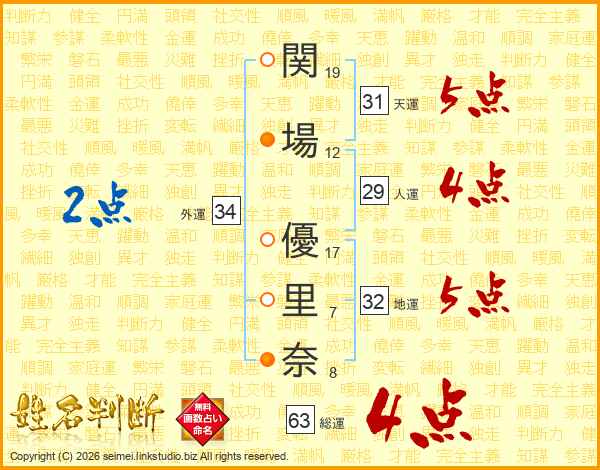 関(19画)場(12画) 優(17画)里(7画)奈(8画)