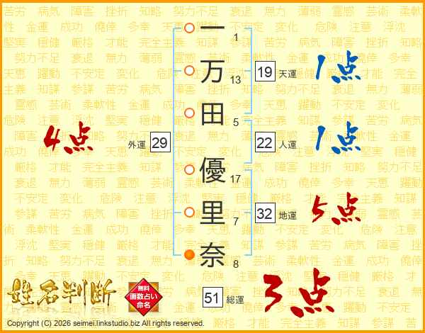 一(1画)万(13画)田(5画) 優(17画)里(7画)奈(8画)