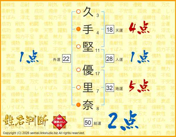 久(3画)手(4画)堅(11画) 優(17画)里(7画)奈(8画)