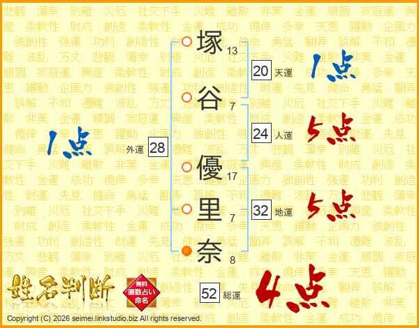 塚(13画)谷(7画) 優(17画)里(7画)奈(8画)