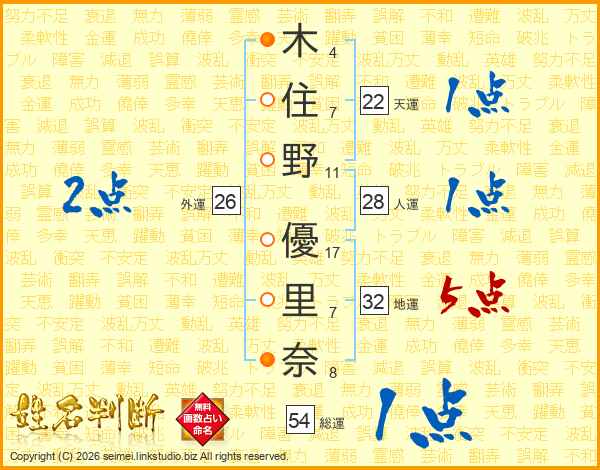 木(4画)住(7画)野(11画) 優(17画)里(7画)奈(8画)