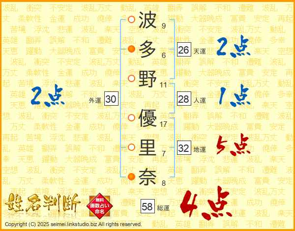 波(9画)多(6画)野(11画) 優(17画)里(7画)奈(8画)