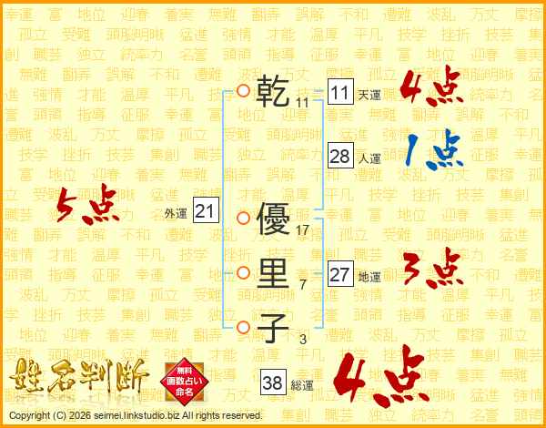 生活面を象徴する運勢です。外部から受ける影響力を表し、結婚運、家庭運や職場、環境への順応性を表します。総運から人運を引いた画数。姓や名が1文字の場合を除く。