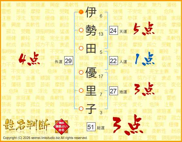伊(6画)勢(13画)田(5画) 優(17画)里(7画)子(3画)