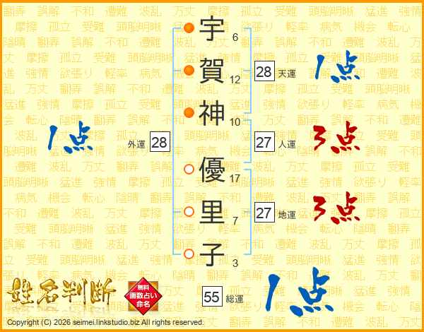 宇(6画)賀(12画)神(10画) 優(17画)里(7画)子(3画)
