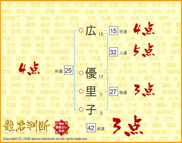 広(15画) 優(17画)里(7画)子(3画)