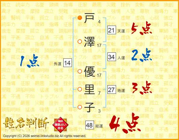 戸(4画)澤(17画) 優(17画)里(7画)子(3画)