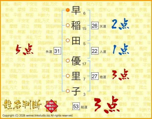 早(6画)稲(15画)田(5画) 優(17画)里(7画)子(3画)