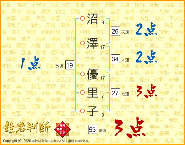 沼(9画)澤(17画) 優(17画)里(7画)子(3画)