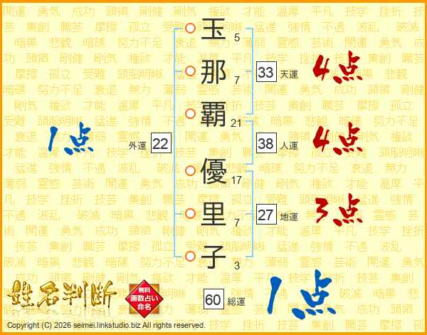 玉(5画)那(7画)覇(21画) 優(17画)里(7画)子(3画)
