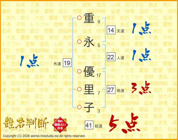 重(9画)永(5画) 優(17画)里(7画)子(3画)