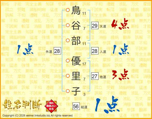 鳥(11画)谷(7画)部(11画) 優(17画)里(7画)子(3画)