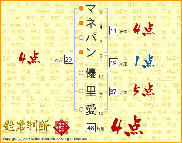 マ(2画)ネ(4画)パ(3画)ン(2画) 優(17画)里(7画)愛(13画)
