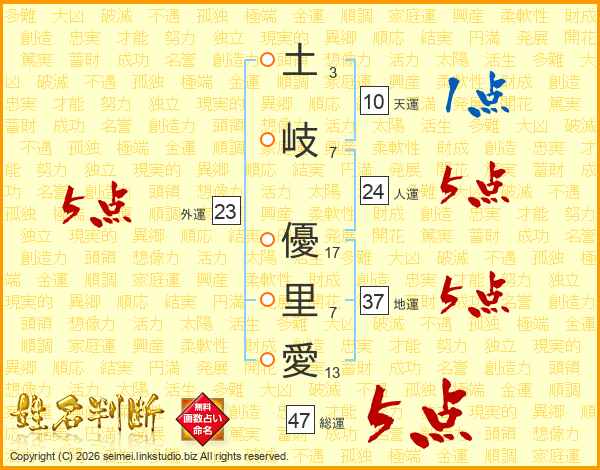 土(3画)岐(7画) 優(17画)里(7画)愛(13画)