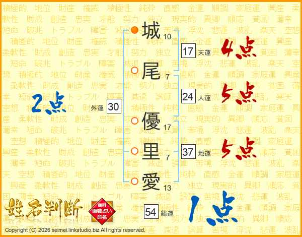 城(10画)尾(7画) 優(17画)里(7画)愛(13画)