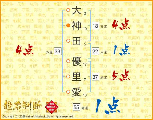 大(3画)神(10画)田(5画) 優(17画)里(7画)愛(13画)