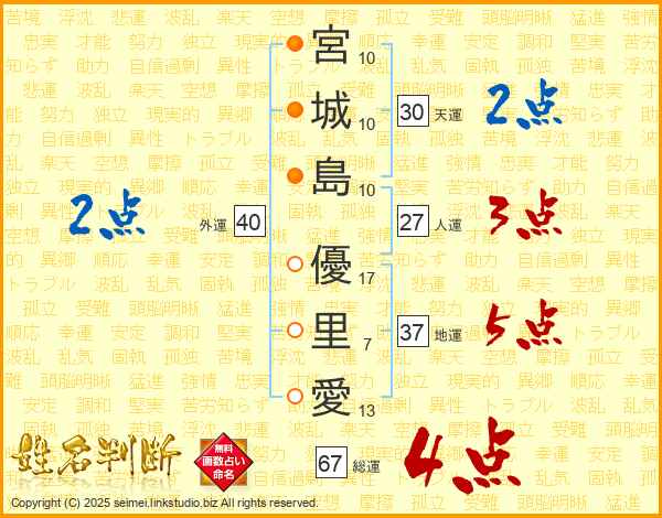 宮(10画)城(10画)島(10画) 優(17画)里(7画)愛(13画)