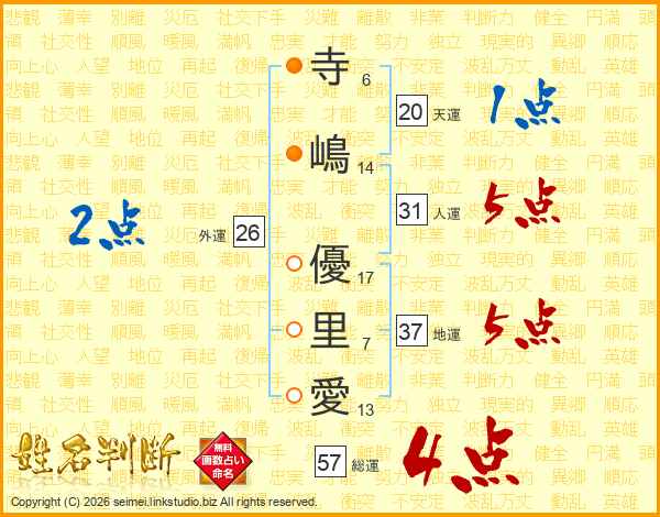寺(6画)嶋(14画) 優(17画)里(7画)愛(13画)