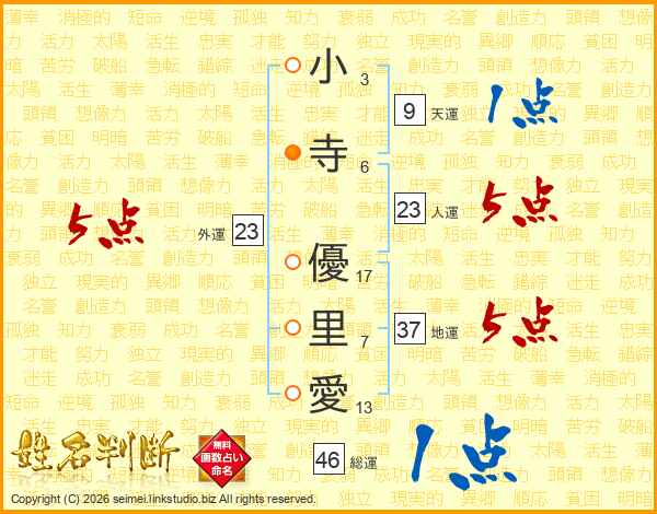 小(3画)寺(6画) 優(17画)里(7画)愛(13画)