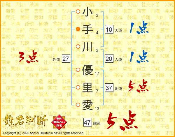 小(3画)手(4画)川(3画) 優(17画)里(7画)愛(13画)