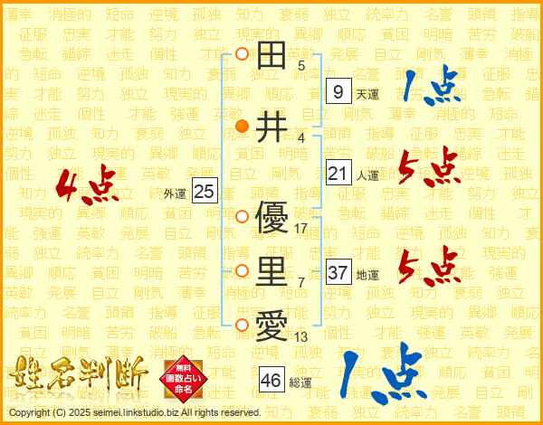 田(5画)井(4画) 優(17画)里(7画)愛(13画)